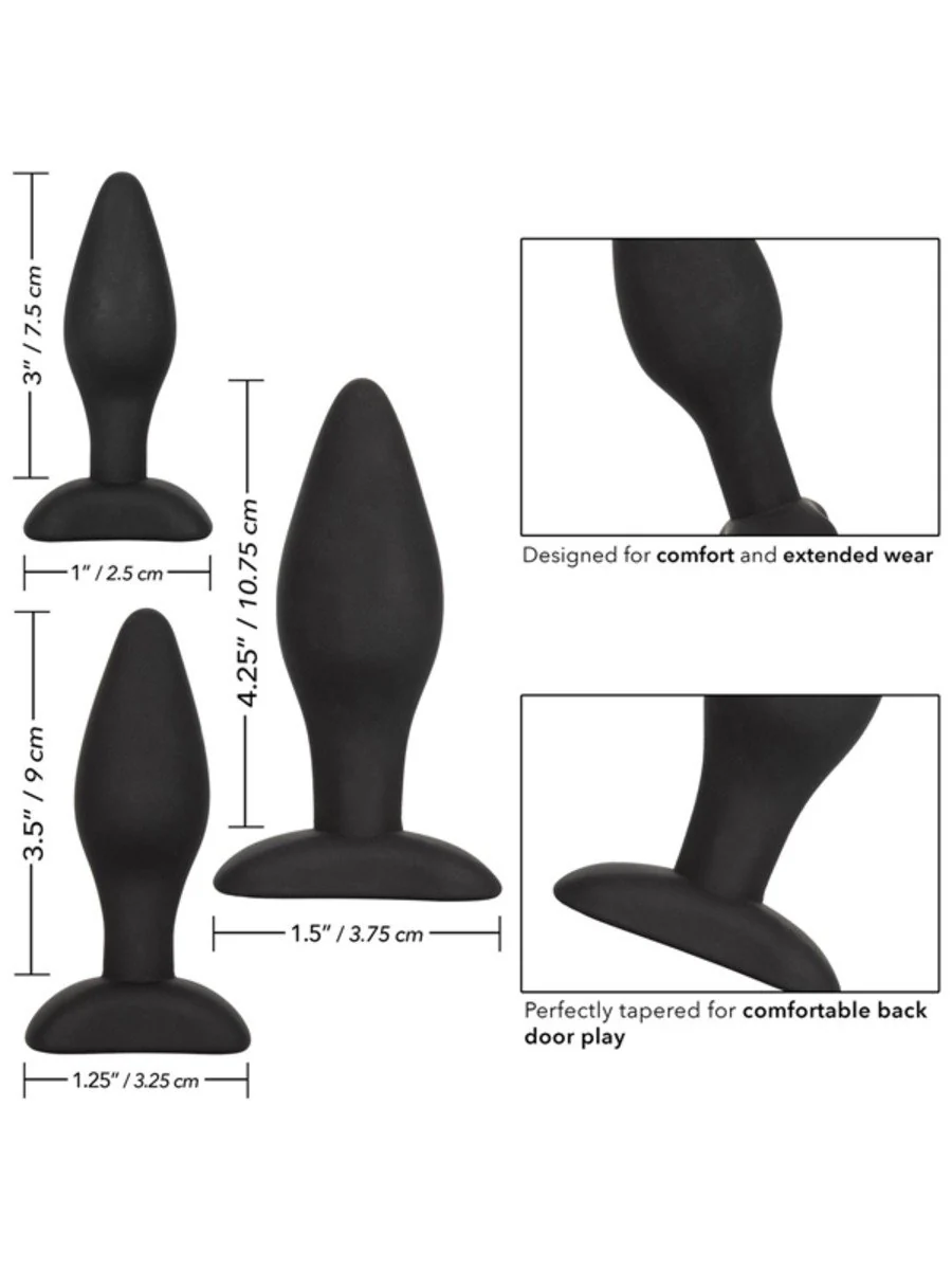 Open the door of thrilling anal sensation with the Silicone Anal Exerciser Kitā¢. This kinky kit includes a set of 3 graduated anal plugs let you safely and comfortably increase passionate anal stimulation. To enjoy everything the exhilarating world of anal play has to offer, training is in order to ensure total safety and satisfaction. Each probe in our kit gradually increases in length and girth for superb pleasure at any level of pleasure play.