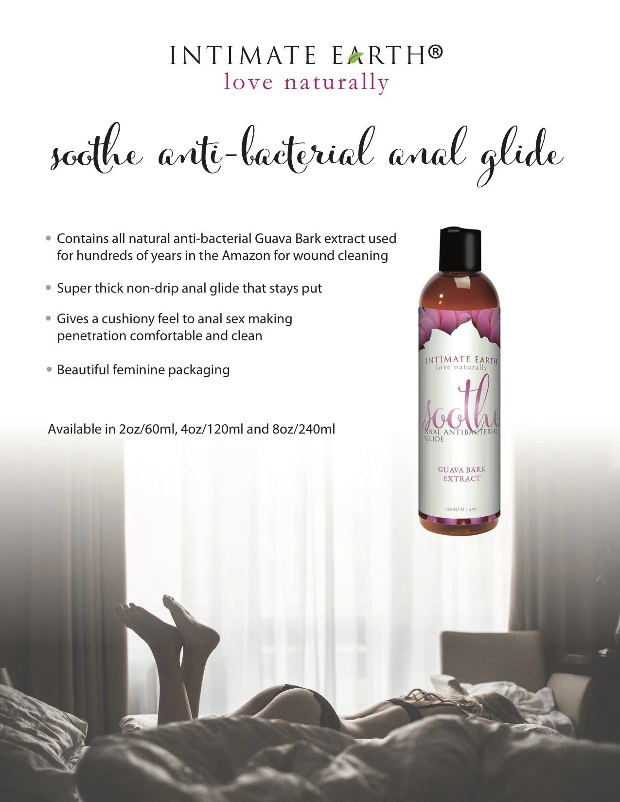 SOOTHE is a premium, paraben free, water and plant derived glycerin anal glide. ThisĀ formula is blended with guava bark extract - a natural anti-bacterial agent. Provides maximum lubrication for comfort and enjoyment of both partners. Safe to ingest.Ā